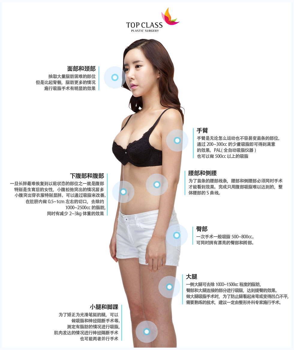 反而会有皮肤凹凸不平或松弛等副作用。因此必须适当的进行手术。一般吸脂的量在3000~5000cc左右,每个部位吸脂的量不同。